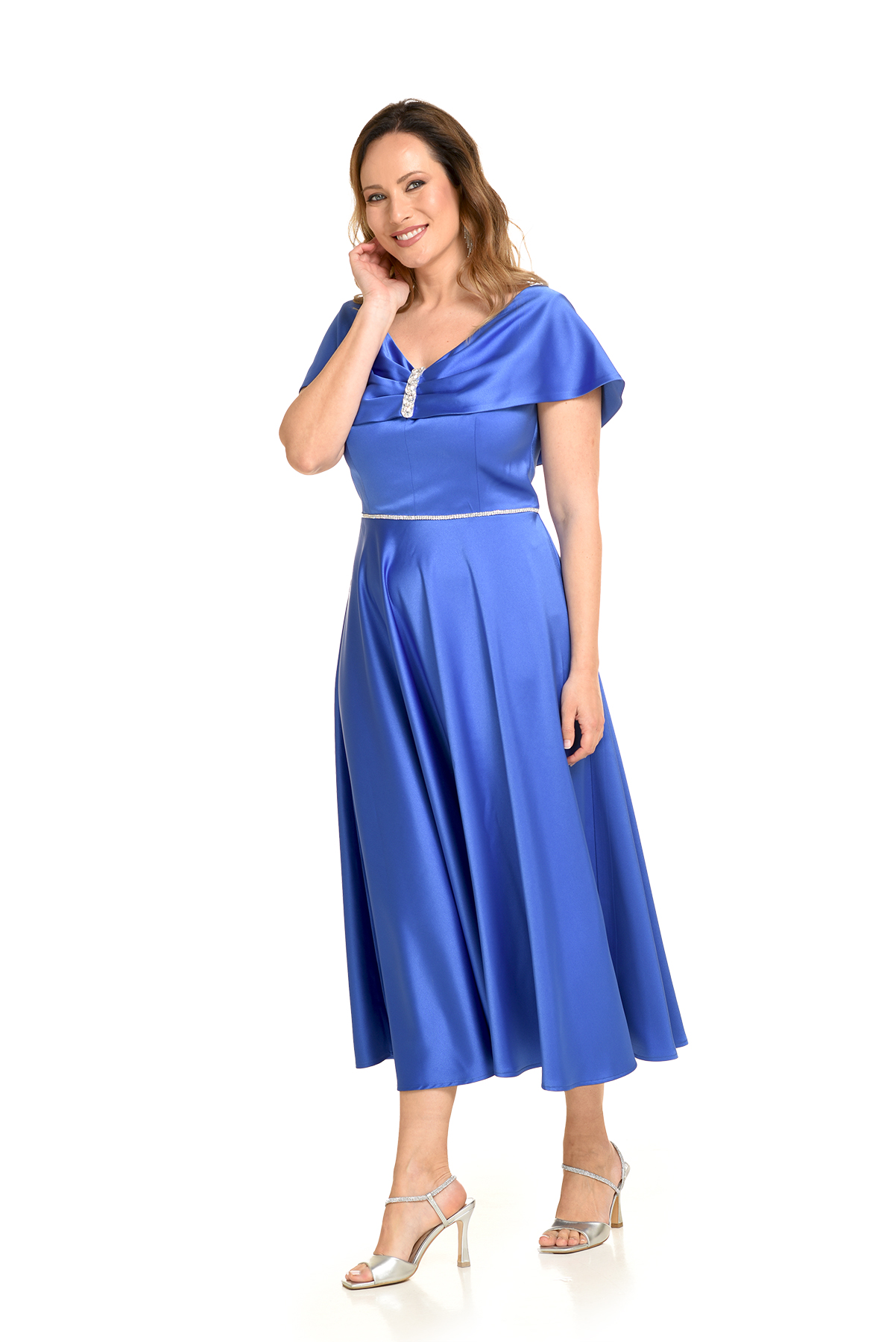 - Φόρεμα μίντι για γάμο σε σατέν σε ραφ χρώμα.