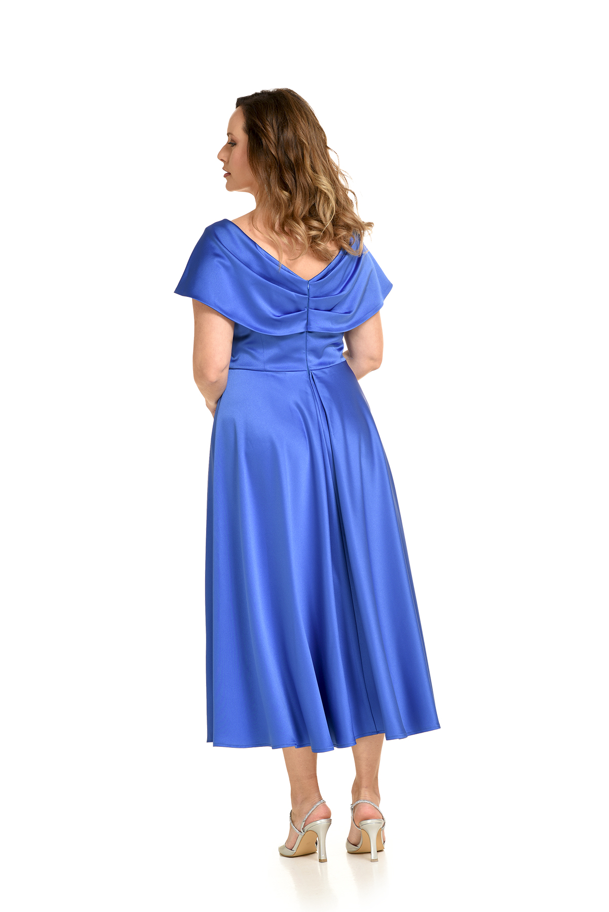 Φόρεμα μίντι για γάμο σε σατέν σε ραφ χρώμα.