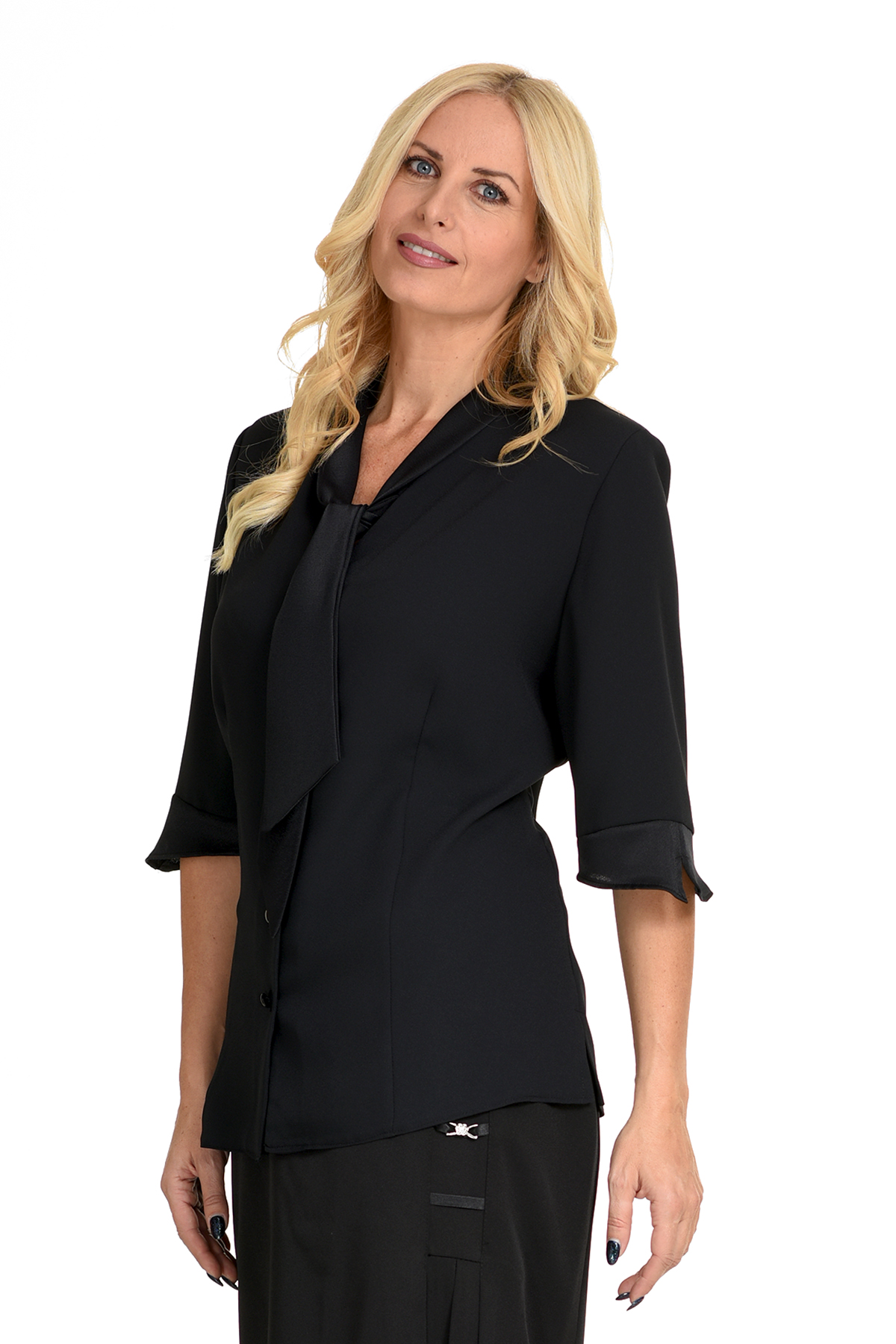 Πουκάμισο μαύρο με γραβάτα σε κανονικά και άνετα μέγαλα μεγέθη. Είναι σε κρεπ ύφασμα και η γραβάτα και το μανίκι είναι σε σατέν ύφασμα.Έχει 3/4 μανίκι για να φοριέται όλο τον χρόνο. Έχει βάτες. Φοριέται και από μέσα και από έξω από την φούστα ή το παντελόνι κ έχει σκίσιμο στο πλάι. Η γραβάτα μπορεί να δεθεί σε στιλ φιόγκου. Διαθέσιμο σε όλα τα νούμερα και για τις plus size πελάτισσες μας.